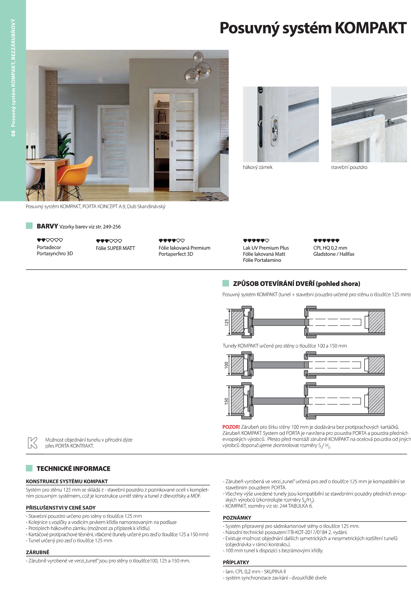 Pokud budou posuvné dveře osazeny hákovým zámkem, zárubeň KOMPAKT pro posuvné dveře do pouzdra nebo dorazový sloupek (posuvný systém po stěně PORTA) budou osazeny protiplechem.
